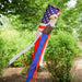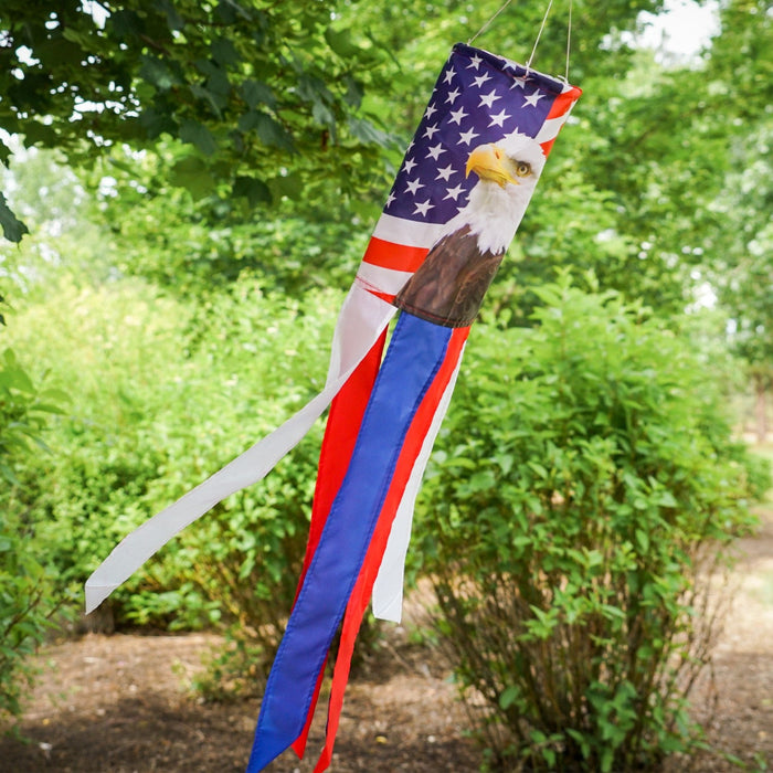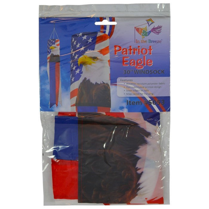 The Patriot Eagle 30" Windsock features a detailed, vibrantly colored regal eagle design with a stars and stripes background. This quality windsock has sewn edges on the tails for lasting enjoyment. Lightweight, weather and fade-resistant material.