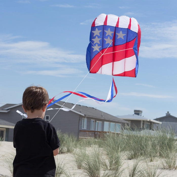 The 7.5 Patriot Wave Air Foil has an aerodynamic cell structure inflated by wind. Air pressure keeps the sail open and holds the kite’s shape while it flies. This style of kite is known to be a stable and easy flier. This is a great travel kite with no fiberglass spars to break and a cinch to pack up with the included bag. These are single line kites, great for the novice to intermediate kite enthusiast.