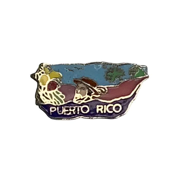 Metal Pin measures 7/8" and comes with a backer to attach to a garment or hat. Features fun Puerto Rican imagery.
